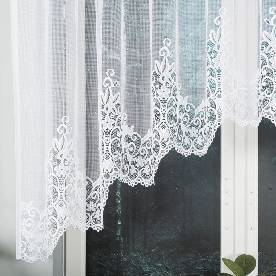 Firanka żakardowa ozdobiona po całości drobnymi kropeczkami z eleganckim, kwiatowym wzorem u dołu.