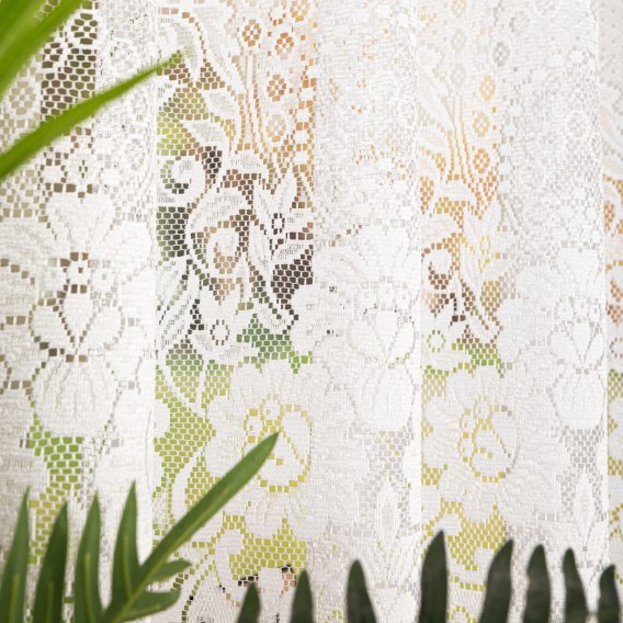 Firanka profilowana w kształt łagodnego łuku, bogato zdobiona po całej powierzchni o urozmiconym wzorze. Dzięki bardziej przejrzystej strukturze materiału u dołu firanki kwiaty nabierają lekkości i przestrzenności, jakby unosiły się nad tłem.