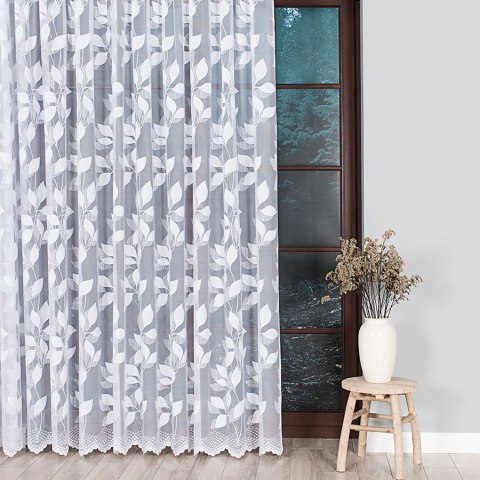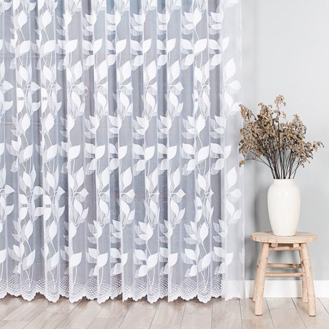 Firanka fantazyjna w białym kolorze z bogatym florystycznym wzorem z motywem liści. Dół firanki wykończony jest lekką falą, ozdobiony drobnymi kropeczkami. Całość prezentuje się bardzo naturalnie i wiosennie. Prosty wzór sprawia, że firanka jest uniwersalna w swoim zastosowaniu i będzie ładnie się prezentować w każdym wnętrzu.