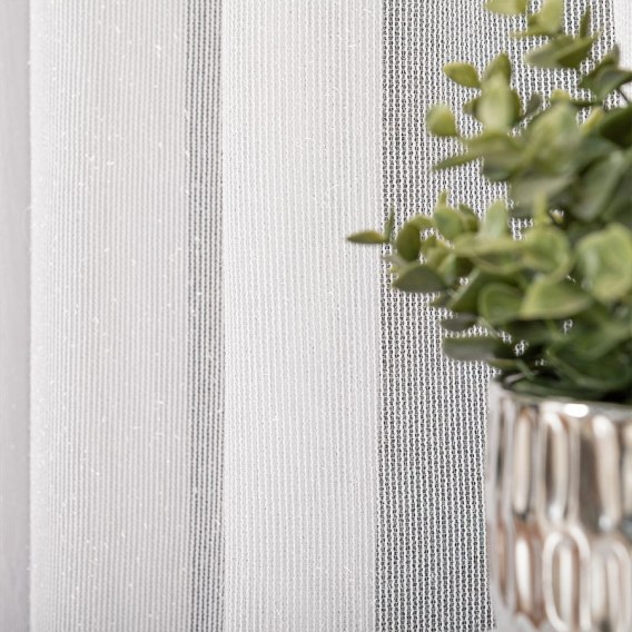 Puszysta firanka w typie siateczki o gęstych oczkach. Urozmaicona po całości błyszczącym meszkiem, który bajecznie mieni się w świetle. Wykończona u dołu ołowianką.