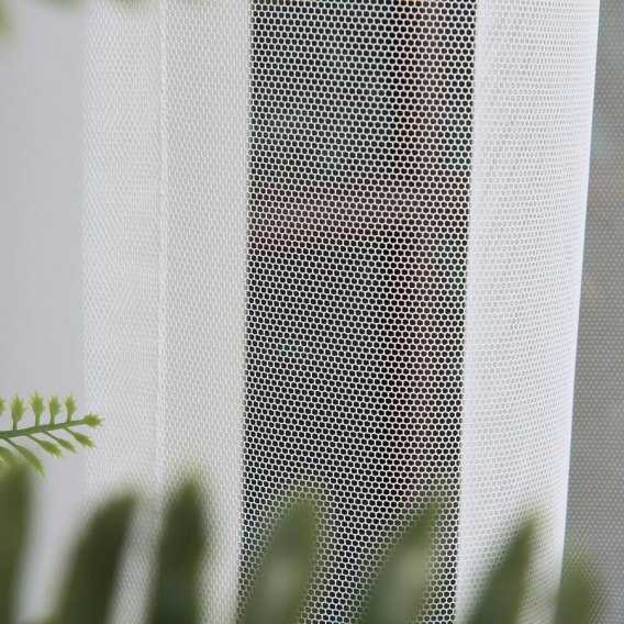 Transparentna firanka na greckim tiulu o drobnym, widocznym oczku. Gładka - bez wzoru. Wykończona u dołu na prosto bez ołowianki.