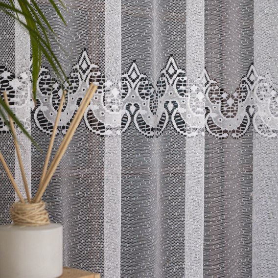 Firanka żakardowa ze wzorem pasowym, wys. 150cm, kolor biały 361270/000/001/000150/1