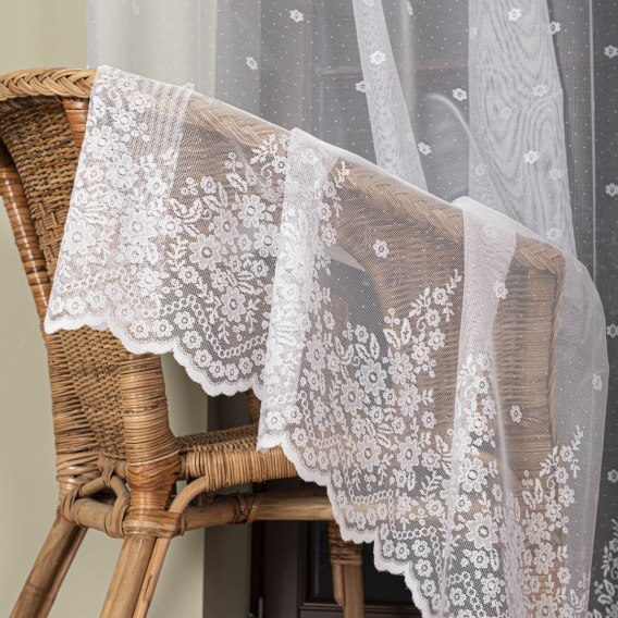 Firanka o drobnym oczku. Wzór pasowy u dołu, ozdobiona po całości pasami pojedynczych kwiatków. Dół wykończony w drobne chmurki.