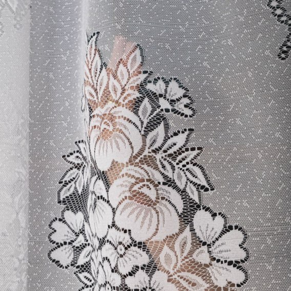 Firanka żakardowa, wykończona w fale, ozdobiona pasowo wzorem kwiatowym.