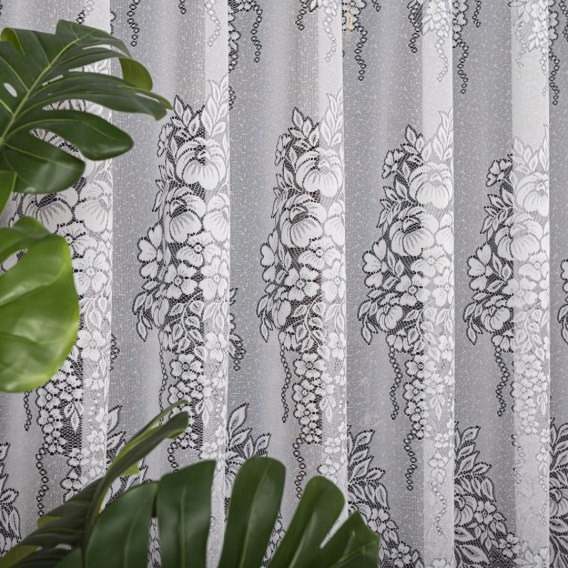 Firanka żakardowa, wykończona w fale, ozdobiona pasowo wzorem kwiatowym.