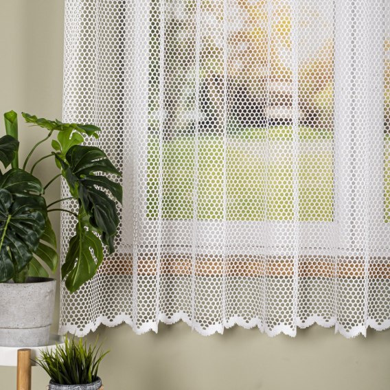 Firanka żakardowa w średniej wielkości oczka, wykończona u dołu w kształt chmurki.