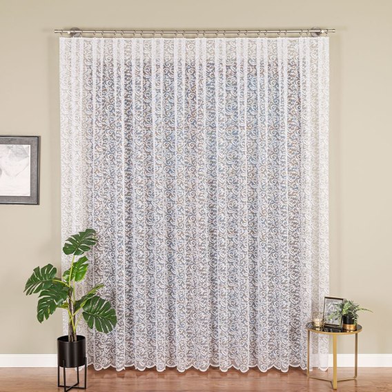 Biała firanka żakardowa, wykończona u dołu w drobne chmurki. Firanka posiada wzór w finezyjne zawijasy o roślinnym motywie.