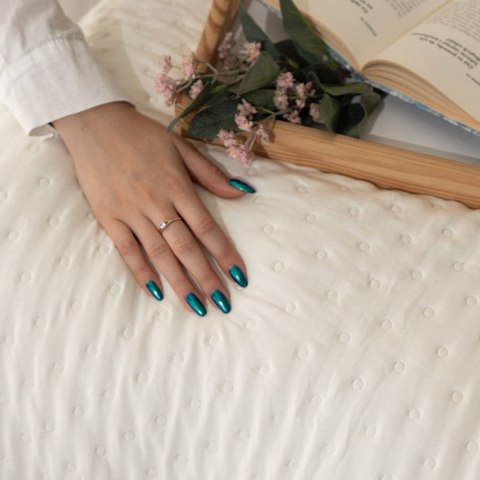 Narzuta dekoracyjna z tłoczonym wzorem w okrągłe pierścienie. Narzutę uszyto z bardzo miłego w dotyku materiału.