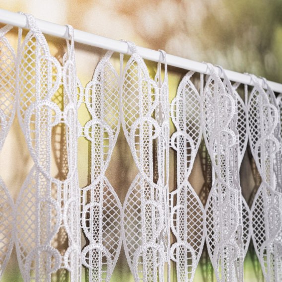 Dzięki fabrycznie przygotowanym oczkom u góry, firanka jest przystosowana do zawieszenia na mini karniszu do zazdrostek. Panelowy układ wzoru wydziela indywidualne segmenty, które po odcięciu, nie wymagają obrębiania i od razu stanowią gotową do zawieszenia zazdrostkę.